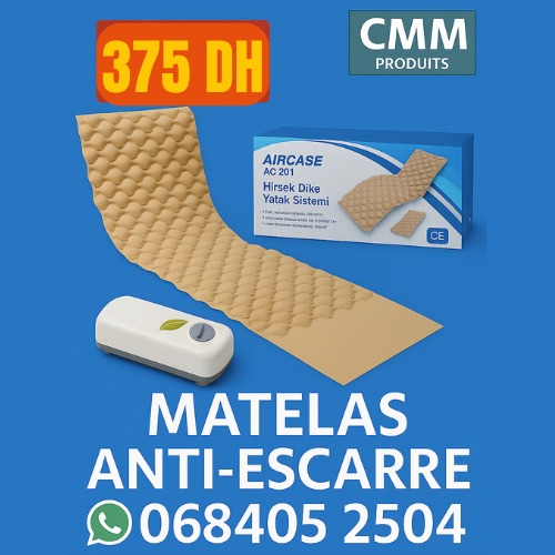 matelas anti escarre maroc, matelas à air médical, matelas alvéolaire, prévention escarre, matelas alité longue durée, équipement médical maroc, lit médicalisé accessoire