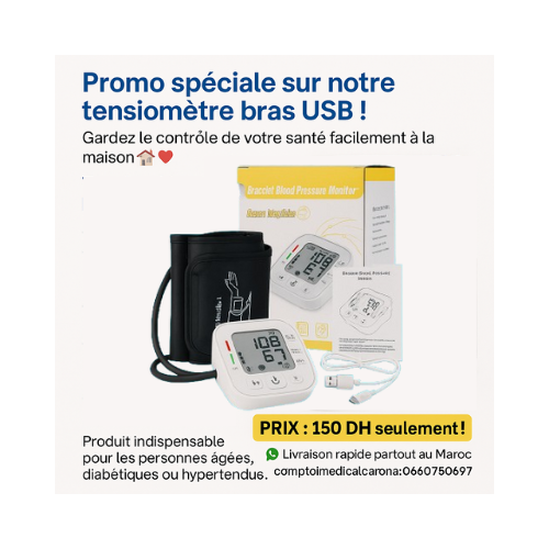 Ne ratez pas notre promo spéciale sur le Tensiomètre Électronique Bras USB Rechargeable ! À seulement 150 DH, gardez un œil sur votre tension et votre pouls, facilement et avec précision, directement à la maison.